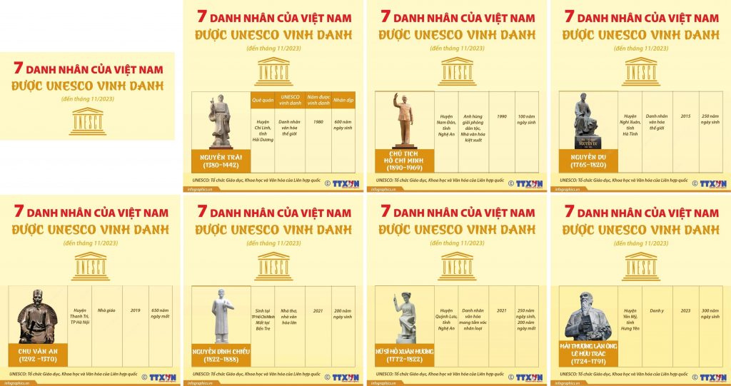 [Kennet Team] Trong hành trình lịch sử của Việt Nam, những danh nhân kiệt xuất đã không ngừng để lại dấu ấn sâu đậm qua các tác phẩm, tư tưởng và hành động của mình. Những giá trị văn hóa, giáo dục, và y học của họ không chỉ được tôn vinh trong nước mà còn được tổ chức quốc tế UNESCO công nhận. Bài viết này sẽ dẫn bạn khám phá sự vinh danh đặc biệt dành cho bảy danh nhân tiêu biểu của Việt Nam, những người đã góp phần làm rạng danh đất nước trên trường quốc tế. Từ Nguyễn Trãi, Hồ Chí Minh, Nguyễn Du, Chu Văn An, Nguyễn Đình Chiểu, Hồ Xuân Hương đến Hải Thượng Lãn Ông Lê Hữu Trác, mỗi người đều mang trong mình một câu chuyện riêng, một đóng góp đặc biệt cho nhân loại. Cùng tìm hiểu về cuộc đời và những cống hiến của họ, và hiểu vì sao họ xứng đáng được UNESCO vinh danh.