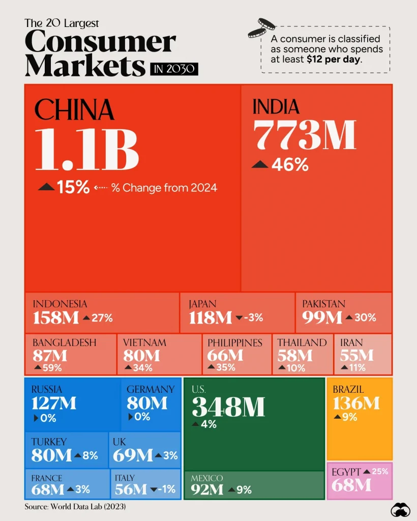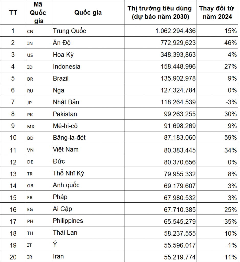Dựa trên dự báo của World Data Lab đầu năm 2024, một tổ chức chuyên phân tích chi tiêu toàn cầu, 20 thị trường tiêu dùng lớn nhất năm 2030 đã được xác định. Người tiêu dùng được định nghĩa là người chi tiêu ít nhất 12 đô la mỗi ngày, theo dữ liệu từ Ngân hàng Thế giới, Liên Hợp Quốc, Eurostat và OECD.