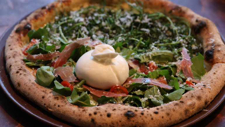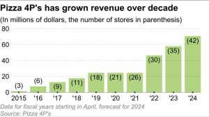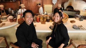 Các nhà sáng lập Pizza 4P’s, Yosuke Masuko (trái) và Sanae Takasugi ngồi tại chi nhánh Pizza 4P’s ở Tokyo. Những cựu nhân viên công nghệ thông tin này áp dụng cách tiếp cận dựa trên dữ liệu để tạo ra những món ăn tâm hồn. (Ảnh của Ken Kobayashi).