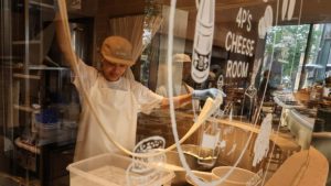 Một người làm phô mai tại 4P’s Tokyo biểu diễn trong khi làm phô mai. (Ảnh của Ken Kobayashi).